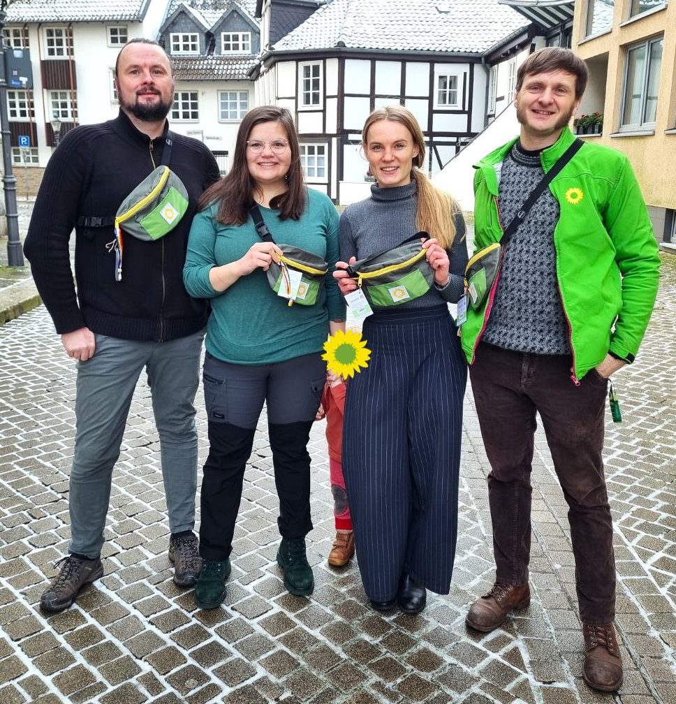 Wie auf dem Bild zu sehen ist, hat unser Mitglied Antonia die handgefertigten Bauchtaschen aus recycelten Zeltstoffen an das Team und die Kandidatin @lisa.jalyschko von Bündnis 90/Die Grünen überreicht.